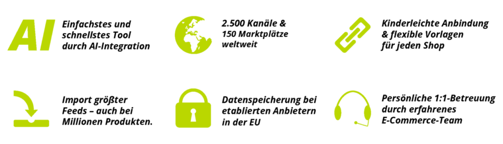 - 2.500 internationale Kanäle, wie Marktplätze, Google Shopping, Social Media und Preisvergleichsportale.