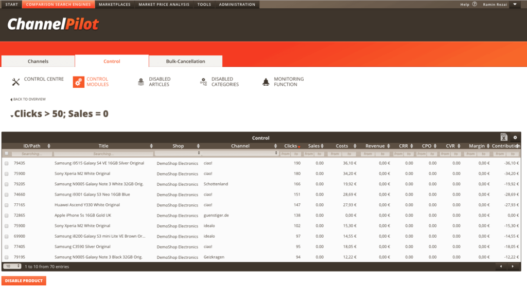 If you click on the control module, you will see all the SKU’s that have reached more than 50 clicks in the selected time period which have not generated any sales. If you intend to disable SKU’s manually, you are able to select and deactivate them individually.