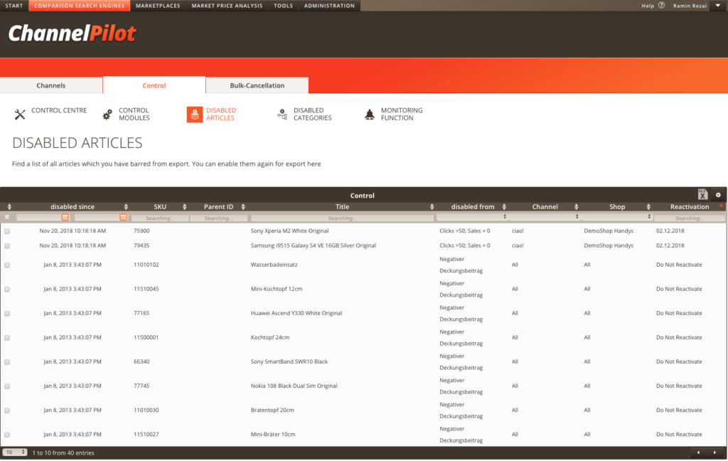Afterwards, you will find all products paused by Channel Pilot Pro in the menu under “disabled articles”. You can use this table to manually reactivate products and see if an item has an automatic reactivation. In the example below you can see that SKU’s 75900 will be reactivated on December 2nd. This table filters and shows you the SKU’s that have been disabled by a module by a given channel for a set period of time